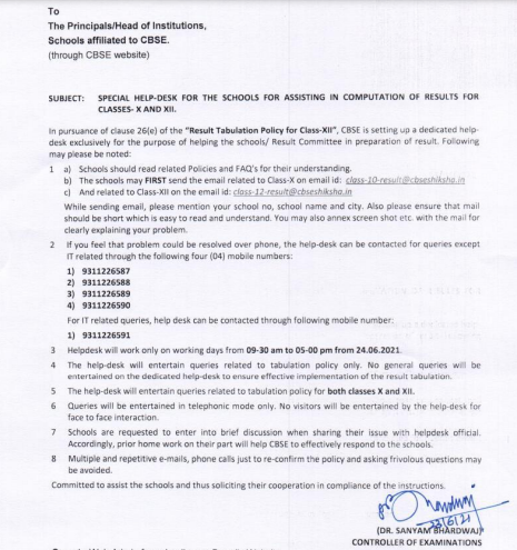 Central Board of Secondary Education (CBSE) sets up a special helpdesk for schools for helping in the computation of 10th, 12th results. Schools or result committees can send their queries to the CBSE board via email or phone. The helpdesk will function on all working days from 9:30 am to 5 pm.