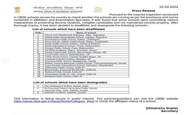 “According to a surprise inspection conducted in CBSE schools across the country to check whether the schools are running as per provisions and norms contained in affiliation and examination by-laws, it was found that some schools are committing various malpractices,” Mr. Gupta said. Mr. Gupta said, “After a thorough inquiry, it has been decided to disaffiliate and downgrade the schools.”