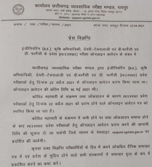 Chhattisgarh Professional Examination Board (CG Vyapam) has postponed the release of the application form for the Chhattisgarh Pre Pharmacy Test (CG PPHT). As per the official notification, the authority has informed that due to the COVID-19 lockdown, the CG PPHT registration process has been postponed till further notice. As per schedule, the CG PPHT application form 2021 was to be released today, April 22.
