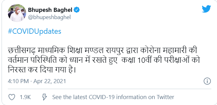 The secretary of CGBSE, VK Goyal said that if a student has not completed the assignment work or has not achieved the minimum marks required, then such students will be awarded passing marks. in an official statement. Chief Minister of Chhattisgarh Bhupesh Baghe announced that “Chhattisgarh Board of Secondary Education, Raipur has canceled the examinations of class 10th, in view of the current situation of Corona epidemic.”