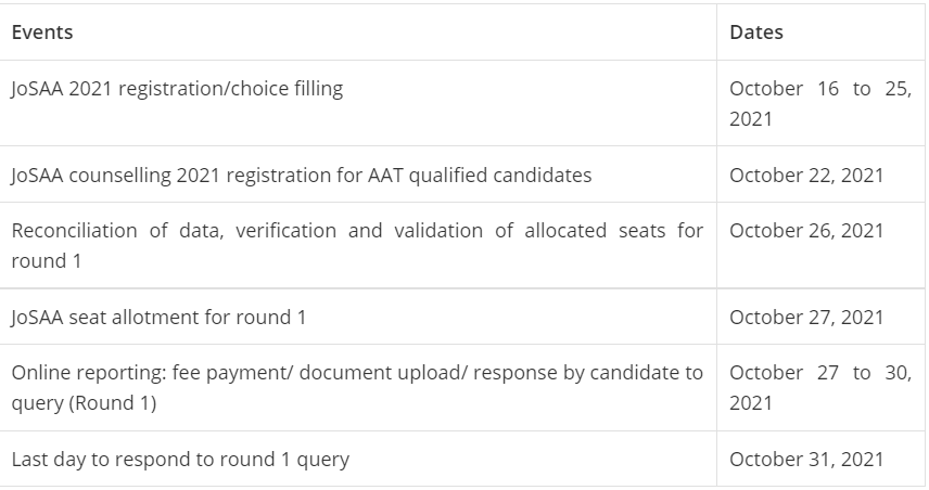 JoSAA 2021 counseling dates – Round 1