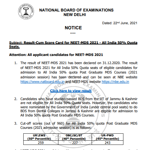 The National Board of Examinations (NBE) has released the NEET MDS 2021 result for admission to All India 50% quota seats. Aspirants can access the result in the form of the NEET MDS merit list at natboard.edu.in.