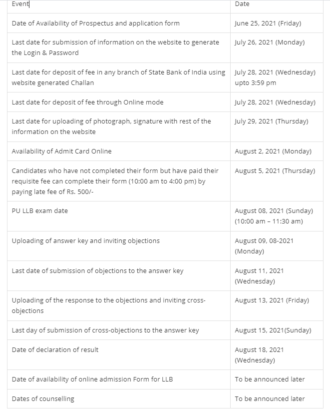 PU LLB 2021 Important Dates here